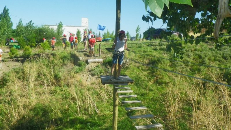 La actividad consta en atravesar un sistema de diferentes puentes colgantes asegurados mediante arneses de seguridad y una vez finalizado el último tramo, volveremos por medio de una pequeña tirolesa.